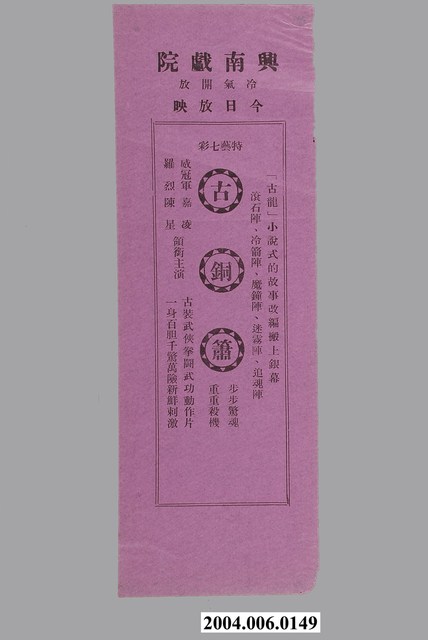 彰化興南戲院提供觀眾的臺灣武俠動作片《古銅簫》(1978)本事,單面單色印刷於粉紅色紙張,標題「興南戲院」、「冷氣開放」、「今日放映」,其下搭配文案「『古龍』小說式的故事改編搬上銀幕」、「古裝武俠拳鬪武功動作片,一身百胆千驚萬險新鮮刺激」等。