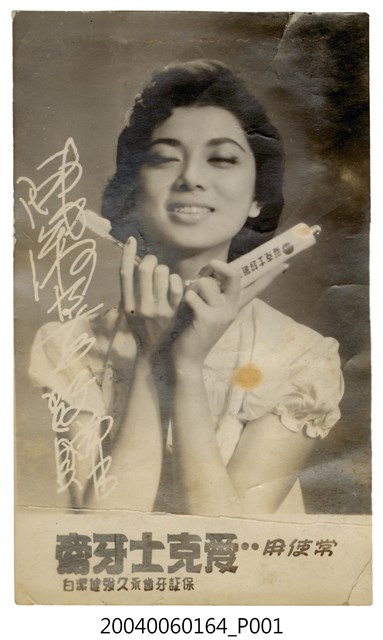 1.「愛克士牙膏」直式廣告照片,直式雙面,正面為陳淑芳小姐短髮的半身像,身穿白色澎澎袖上衣,一手拿愛克士牙膏,擠了一點在另外一隻手手上的牙刷,放在下巴,露出潔白的牙齒微笑。照片左邊則註記「陳淑芳敬贈」,字跡較為飄逸難以辨識,下方留白版面則有文案「常使用...愛克士牙膏,保證牙齒永久強健潔白」。海報年代久遠,因此白色處已經泛黃,而且表面有多有摺痕。海報背面全白,一樣有許多黃色污漬,只有左側版面則有書寫痕跡,藍筆註記「淑芳」,下方則有一些亂畫的痕跡。2. 愛克士牙膏為1957年光南化工廠申請正字標記許可後生產,此份海報推測於1957年之後所推出的牙膏廣告海報。
