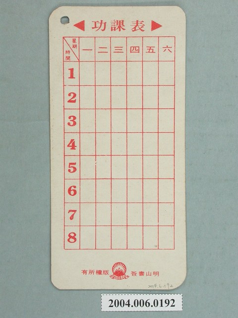 1.邵氏電影明星金漢在臺發行中文彩色明星書卡,直式雙面,正面背景為藍色直線線條背景,金漢身著西裝,胸口則配戴紅色絲巾,帥氣挺拔,一臉自信的微笑,面向右側。下方留白版面則標註「邵氏明星之3,金漢」,左邊則是邵氏影業的招牌標誌。書卡右上角則有穿一圓孔,狀況尚佳。書卡背面則是用紅色色調製作功課表表格,下方則標註版權為明山書局所有。表面有點泛黃,大抵良好。2.此書卡為明山書局出版一系列明星書卡,取金漢1960-1970活躍時期的照片,曾出演《花木蘭》、《筧橋英烈傳》等作品,與演員凌波為夫妻。