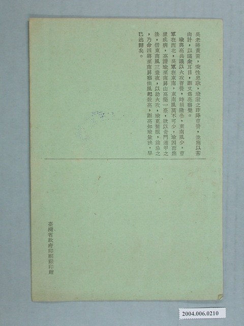 1.本物件是1份來自臺灣省政府員工國劇研究社的入座券,採自由入座,封面上有表演的團體、表演劇目、時間與地點等內容。時間為民國45年(1956年)5月5日下午7點開演,地點在臺灣省政府警務處大禮堂,表演劇目為班串、黃金臺、女起解與群英會借東風。左上原本有個截角,已被撕除,此入座券採自由入座,為非賣品。內容為劇目的劇情與演員名稱,封底有劇目內容尚未結束,但在左下角有印上「臺灣省政府印刷廠印贈」。物件以綠色紙張印刷,邊框稍有泛黃,截角處被撕除。
