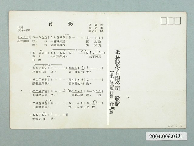 臺灣知名藝人劉文正的明信片,由歌林股份有限公司發贈。正面為劉文正的黑白照片,搭配「歌林之星」、「背影」等字樣;背面則是歌曲〈背影〉的簡譜及歌詞,並有「歌林股份有限公司敬贈」等字樣。
