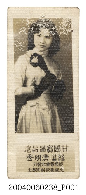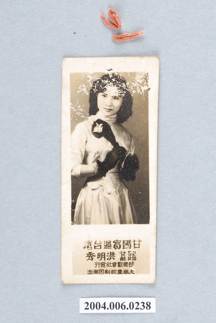 臺灣女星洪明秀黑白時裝照的書籤卡,單面照相紙材質,並附有一橘色綁繩。本件上方為洪明秀身穿禮服照片,下方標註「甘國寶過台灣」、「台語巨片女主角洪明秀」、「台榮影業社發行」、「大振豐歌劇團演出」等字樣。