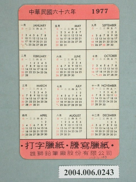 1.臺灣電影明星張艾嘉在臺發行中文彩色年曆卡,直式雙面,背景為黑色,中間則留一橢圓版面給張艾嘉,視線往上探看,一頭及肩微捲短髮,粉橘色上衣,面露靦腆微笑,右上角則押上「雄獅Lion文具」,表面則有點褪色,大抵良好,背面則是1977年的年曆,上方則是橘色版面,下方特別標注「打字蠟紙,謄寫蠟紙,雄獅鉛筆廠股份有限公司」。狀況尚佳。2.張艾嘉為1973年嶄露頭角,活躍至今,曾參與過多部電影如:《梅花》、《八百壯士》、《瘋劫》。