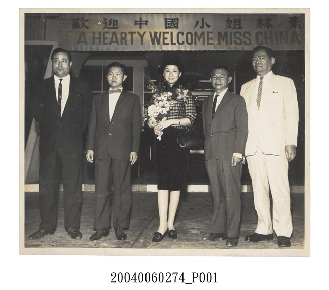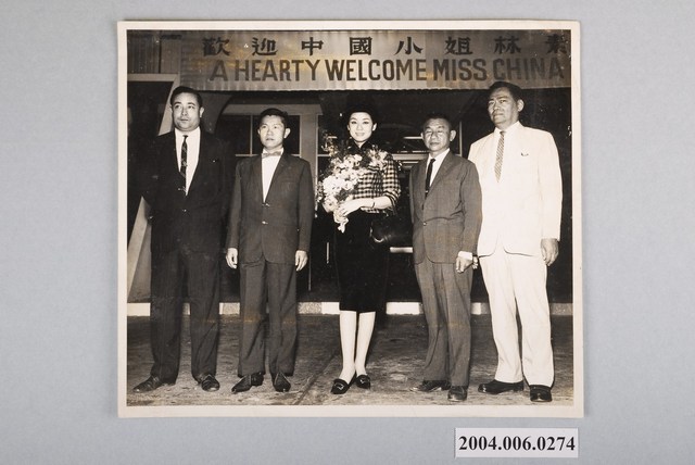 1.中國小姐第四屆第一名得主林素幸代表參選世界小姐選美活動接機黑白照片,橫式單面,正面為林素幸小姐微笑與其他四位官員合照,她身穿優雅窄裙手持花束站立於正中間,右邊版面靠近林素幸女士可能為父親,左邊可能為華人官員,最左邊那位為英國官員,白色西裝男士身份不詳,表面有白點,推測因為磨損而脫落。2.第四屆中國小姐於1964年舉行,總共舉辦四屆,由八方傳播公司主辦。與其他三位第一名為趙令瑜、于儀及林素幸,林素幸則獲得倫敦世界小姐選美第三名,此照片推測為林素幸小姐降落至倫敦之後的接機照。