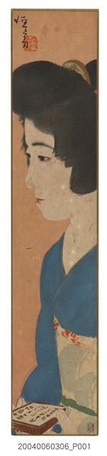 本件為主婦之友(新年號)附錄《花鳥‧山水‧美人畫短冊卅人集》之北野恒富繪美人畫,日本期刊《主婦之友》1917年創刊,第17卷第1號1933年出刊,隨刊附錄日本當代名畫家共30人的短册,例如伊東深水、伊藤小坡等人。此件是由北野恒富(1880~1947)所繪美人畫。