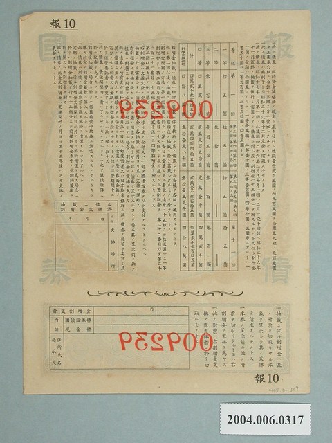 1.本物件是日本勸業銀行所發行的報國債券,右上角有印「報10」。債券以花朵和植物枝葉設計外框;框內由上往下依序印有:「第拾回 拾ノ組」、編號「009239」、「割增金附」、「報國債券」、面額「金五圓」,下方文字則註記此債券依臨時資金調整法規定發行,所賣出的收入金由大藏省預金部運用;債券右側蓋有紅色的日出、軍機及「支那事变報國債券」文字的圓戳章;債券左側的發行日期、機構名稱之下蓋有紅色總裁圓印鑑。債券正面最下方有附票,由付款方支付獎金時記錄,並剪下歸檔用。債券背面內容說明此債券發行總金額,發行面額有10圓、5圓券2種,以及未來割增金的獎金項目、抽籤、支付方式等。