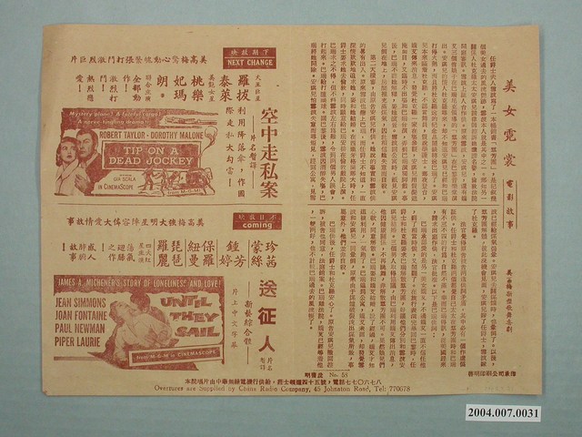 一面右半部是喬治庫克(George Cukor)導演的美國歌舞片《美女霓裳》(Les Girls, 1957)的本事,左半部則是下期上映、搭配劇照介紹的2部電影廣告,包括Richard Thorpe導演的美國片《空中走私案》(Tip on a Dead Jockey, 1957,片名暫譯,後改為國際飛龍黨)、Robert Wise導演的二戰愛情片《送征人》(Until They Sail, 1957,片名暫譯)等。