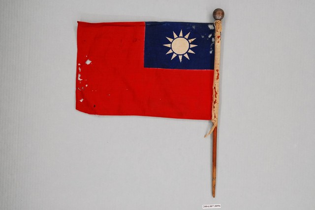 此物件為中華民國國旗,旗幟有若干破損痕跡,其與旗桿相繫之處亦有顯著的磨損。 中華民國國旗,為青天白日滿地紅旗,而國旗的前身青天白日旗則是由孫文革命初期的同伴,同時是同鄉好友的陸皓東所創,後青天白日旗便被定為中國國民黨前身的中興會會旗,後在成員經過辯論後,成為同盟會會旗。而現今的青天白日滿地紅旗,原先在1912年成為北洋政府的海軍旗,在1921年成立廣州中華民國政府之時,才正式定為國旗並沿用至今。國旗以藍、白、紅三色為主,分別代表自由、平等、博愛以及民族、民權、民生之意。