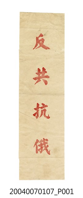 此物件為以楷書字體寫成的「反共抗俄」標語。 此批物件中另有提到「共進造紙廠」一詞,「共進造紙廠」為一間於1925年創辦的造紙公司,由臺中潭子地方的商人羅安所創辦,在日治時期的戰爭期間,生產水泥袋供日本軍方使用,並改名為「南日本造紙株式會社」,在戰後改回原名,主要生產金紙與包裝紙,另獲得美援後至日本購買新型機械造紙,最終在1972年,因豐原實行都市計畫,因而停業。 此物件為中華民國「反共抗俄」政策的相關出產物,此政策以教育、媒體宣傳深入當時的臺灣社會,在教育方面則有「俄帝侵華史」的課程,蔣中正於1975年出版的《蘇俄在中國》一書更是立刻成為各級學校的必備教材。另在媒體方面則有「印製品加印反共抗俄宣傳標語辦法」的法律為依據,使得各種「殺朱毛」、「消滅共匪、驅逐俄寇」的反共抗俄標語充斥在臺灣社會各個角落。此外也以各種法律跟條例監控、利誘民眾貫徹「反共抗俄」國策。此國策直到1960年代中蘇關係交惡,「反共」與「抗俄」被分開改為反共政策,而在1991年動員戡亂時期終止後,反共政策也成為歷史。