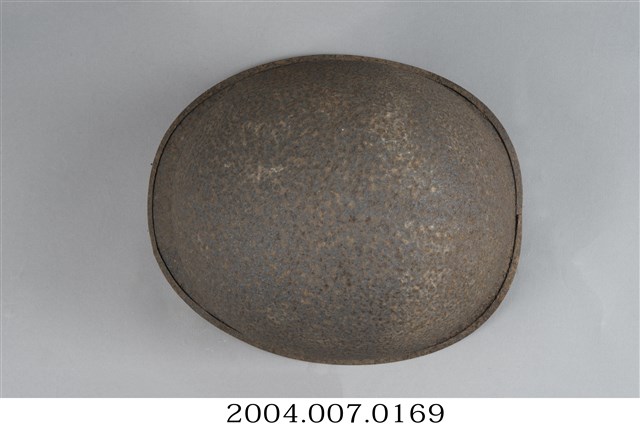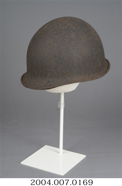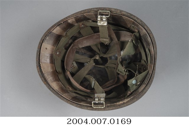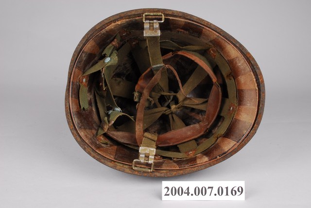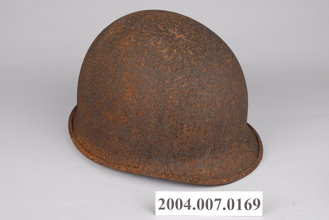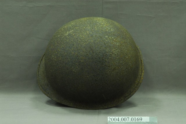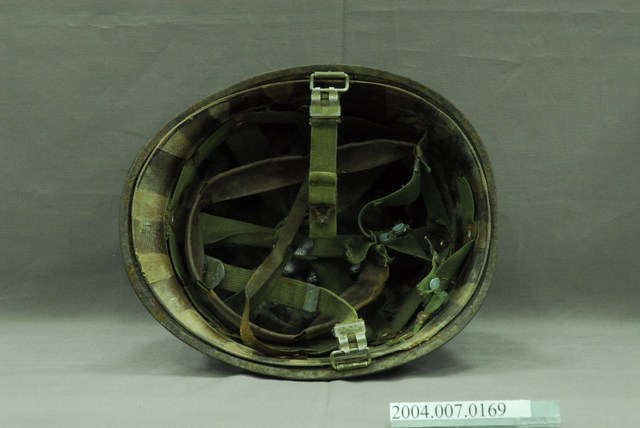 1.此為美軍常用的M1鋼盔,能一定程度防止來自上方的子彈、破片攻擊,不過對於頭部側面、後頸的防護較差。全帽有明顯生鏽情形,可分離的內盔外部大致與外盔相合,支撐懸帶採用耐用度高的織帶,並可調節鬆緊的顎帶。2.鋼盔主要功能為戰爭時保護頭部不受子彈、破片傷害,M1鋼盔二戰自二戰開始被使用,外盔可在與內盔分離後,單獨作為盛水容器或用來坐。