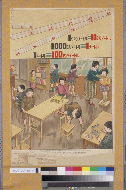 本件為尋常小學校算術掛圖,彩色印刷,由於掛圖右下角有破損情形,無法得知發行者、掛圖標題等出版資訊,掛圖圖面上半部印有長度單位換算表,下半部則是掛圖圖片,可見教室內學童拿著尺測量各種物品的長度,其中右下角學童桌上可見文部省編纂之《尋常小學國語讀本》。圖畫下方印有「教育要旨」、「教育要領」、「適性發展」字樣。