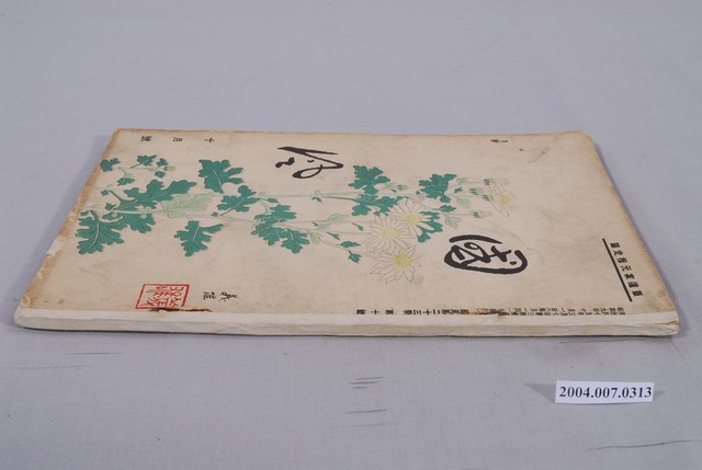本件為《國風》雜誌,第23卷,第10號。該雜誌封面特別標誌「華道家元指定誌」,知其為以花道為主的雜誌。該雜誌發行於明治45年(1912)3月7日。封面以義雄的菊花圖為設計,有「義雄」的落款及用印。