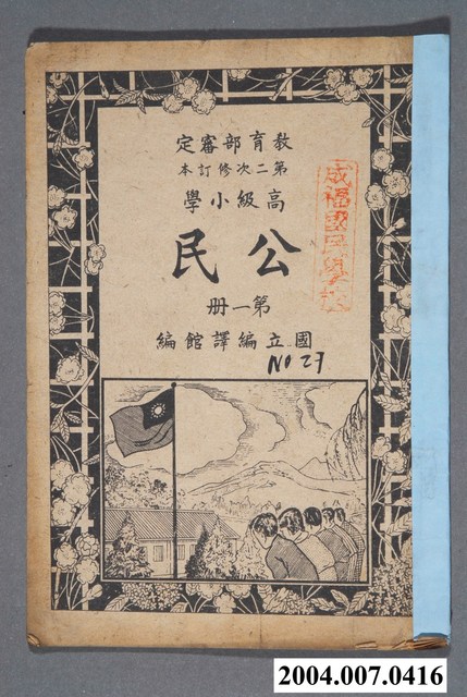 1. 本文物為《高等小學 公民》第一冊,乃教育部審定通過之第二次修訂版本;由國立編譯館編定。正面有「成福國民學校」印,有「No.27」字跡編號。背面有教育部標籤,印有「非賣品」字樣。2.內容有12課:個人的修養、家庭組織、家庭經濟、個人在家庭中的地位和責任、新生活的意義和目的、新生活的實踐、本地風俗習慣的調查和改良、團體的構成和進展、參加團體生活-集會結社、會議的種類和程序、社會的成因和進展、個人對於社會的義務和責任。