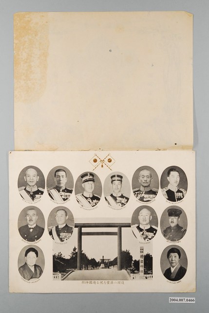 此物件為單張黑白印刷品,印有入祠靖國神社者的肖像與神社景觀照,其外有封套一張,封面書有「御寫真」、「盡忠報國」、「精神作興」等字樣,封面中央的徽章為「桐紋」的其中一種「五七桐」,自戰國時期便被多名大名(地方軍閥)使用,其中最有名者即為豐臣秀吉,後在明治維新之後此紋章便由日本政府使用。 此件提到的靖國神社為日本為紀念因戰爭而殉職的軍官設立的神社,相當於日本的「忠烈祠」,前身是1869年由栖川宮熾仁親王所創立的東京招魂社,目的為紀念明治維新前的「戊辰戰爭」中犧牲的倒幕武士以及為維新奉獻生命的志士,其後在1879年由明治天皇命名為「靖國神社」,是由於在1877年爆發的西南戰爭而改名。靖國神社由於供奉日本二戰戰敗後被盟軍審判法庭審判為掀起戰爭罪刑的「甲級戰犯」14人,因而被中、韓兩國抗議此神社是祭祀侵略者的神社。在這樣的背景之下,參拜神社成為充滿爭議的行為,如小泉純一郎的參拜就引發國外的抗議,而臺灣的高金素梅也曾要求日本政府將被徵調為「高砂義勇軍」的臺灣原住民靈位遷出神社,此外也有日本民眾抗議、反對參拜靖國神社。 此物件與日本官方逐步將臺灣民眾同化為日本人的政策相關。在1937年日本發起中日戰爭,日本本土於同年即開始由近衛文麿內閣發起「國民精神總動員」行動,以「舉國一致、盡忠報國、堅忍持久」為目標,讓國民從精神教育開始,凝聚對國家的向心力。在臺灣方面,總督府亦於同年開始對臺人進行「皇民化」教育,主要內容為寺廟整理、神社參拜、社會風俗的改造、國語普及運動、改姓改名運動以及軍事動員,直到1940年前,此時期的運動都是由總督府倡導,民間自發進行。1940年後,總督府為呼應日本本土的「大政翼贊會」成立,於是在臺灣成立「皇民奉公會」,將同化運動改由總督府主導,相關的活動也執行的更加徹底。