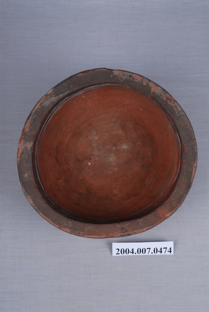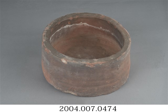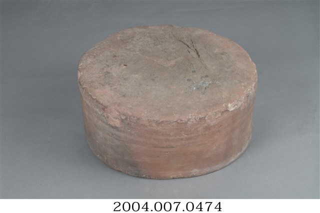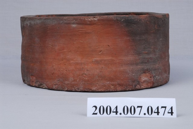 1. 本件為圓形素燒紅陶灶椅,長27公分、寬26.2公分、高12.4公分,此器的胎體土質緻密,頗似紅磚,通體不施釉,器身平直,與常見類似鼓凳的灶椅不同,器面留有許多塑形痕跡,並不平整。2.灶椅又稱灶腳椅,是傳統社會在爐灶邊工作用的矮凳,因在灶旁生火煮食常需彎腰、蹲下,故需要一張椅子來方便操作與節省體力。灶椅一般做工簡單,甚至粗糙,講求實用。本件此類質似紅磚的素燒紅陶,以臺南「歸仁窯」最為人所知,推斷本件即屬此地所產。