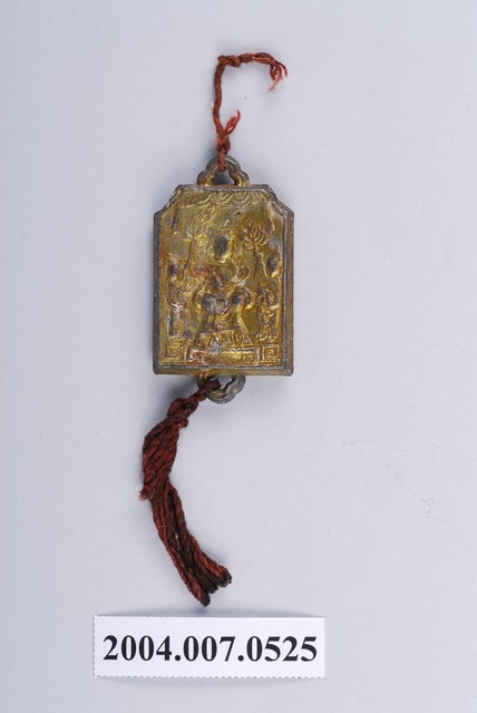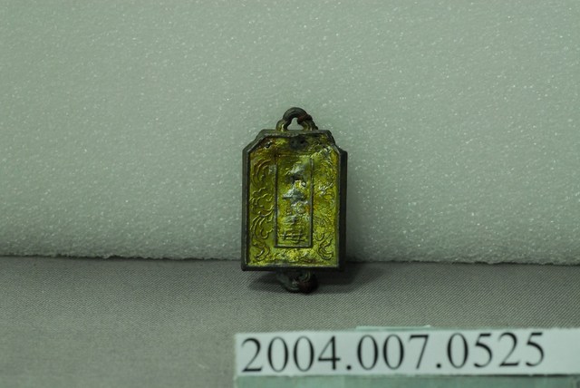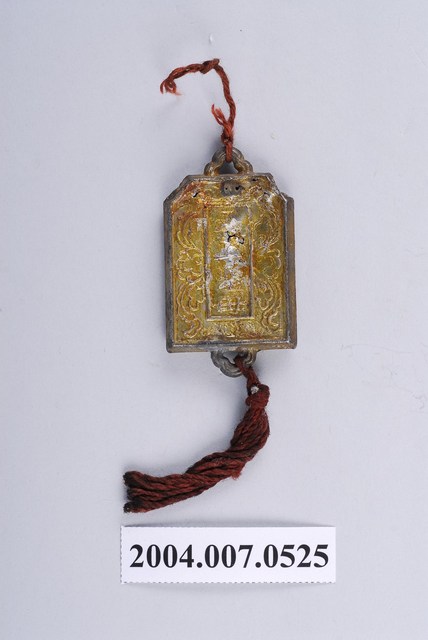 1.本物件為北港朝天宮天上聖母進香牌,錫製鍍金,其中一面刻有「天上聖母」字樣以及神像,另一面則為佛祖圖案,皆為半立體浮凸。進香牌上下各有小環綁著紅色絲線,無法判定確切時間。此進香牌或為該宮廟所製造之產物,作用與平安符等物品相似,不一定與進香活動有直接關連。2.進香原指信徒至名山寺廟朝拜,臺灣因早期移民而移植原籍神明,出現不少分靈或分香的廟宇,因而出現回到祖廟進香以維持其靈威與虔誠性的活動。臺灣著名的進香聖地以王爺廟與媽祖廟為盛,如臺南市南鯤鯓代天府以及大甲媽祖與白沙屯媽祖。進香是為了掬取香火,使本廟的香火興旺,故有更新、增強香火的意義,活動本身亦是社會變遷、常民文化的展現。3.北港朝天宮,是於西元1694年奉請湄洲媽祖渡海來臺,而後開基立廟,起初於簡單的小廟宇祭祀,後著手建廟並於西元1700年竣工,主祀天上聖母,迄今信眾遍布全臺。