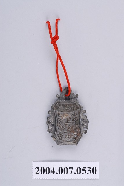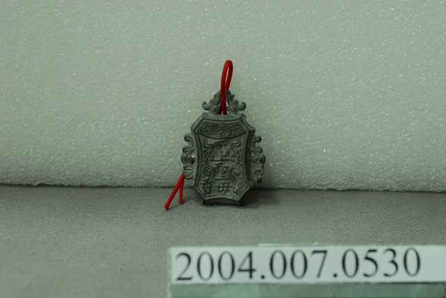 1.本物件為新南港奉天宮進香牌,即為新港奉天宮。錫製,不規則狀,牌面其中一面刻有「新南港」、「天上聖母」、「香火」等字及圖案,另一面則為佛祖圖案與「新南港」字樣,皆為半立體浮凸。此進香牌或為該宮廟所製造之產物,作用與平安符等物品相似,不一定與進香活動有直接關連。2.新港奉天宮與新南港之關聯,是因為新港昔日地名為笨港,但笨港溪易氾濫,便有了笨北港與笨南港之別。後笨南港居民遷徙至距離笨港約三公里外的麻園寮,建立新街市,稱為「笨新南港」,因笨字不雅,去笨稱之「新南港」,後再簡稱為今日之新港。新港奉天宮,座落於嘉義縣新港鄉,起源於明天啟二年(1622)信徒恭請「船仔媽」來臺,康熙39年(1700)笨港居民合建天妃廟,後因洪水氾濫而遷徙,嘉慶16年(1811)奉天宮落成。3.進香原指信徒至名山寺廟朝拜,臺灣因早期移民而移植原籍神明,出現不少分靈或分香的廟宇,因而出現回到祖廟進香以維持其靈威與虔誠性的活動。臺灣著名的進香聖地以王爺廟與媽祖廟為盛,如臺南市南鯤鯓代天府以及大甲媽祖與白沙屯媽祖。進香是為了掬取香火,使本廟的香火興旺,故有更新、增強香火的意義,活動本身亦是社會變遷、常民文化的展現。