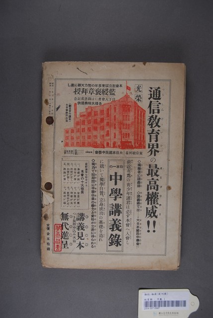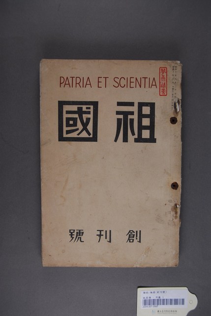 此物件為《祖國》(Patria Et Scientia)創刊號,發行於1928年10月,封面為白色,以標準字標示刊名、期號與發行日期。 此雜誌《祖國》的創辦者,為「二二六事件」中被處刑的日本國家社會主義者北一輝的弟弟北昤吉,北昤吉為日本的思想家、政治家,以及多摩美術大學的創辦人,他在1928年創辦綜合評論雜誌《祖國》,此雜誌本來為得以刊載各種立場言論的政治評論雜誌,後在轉型後轉為日本右翼組織──「祖國同志會」,的機關刊物。 日本在第一次世界大戰過後得益於戰亂帶來的戰爭經濟,國內的景氣大幅提升,然而在1920年代後期的全球經濟恐慌,以及1923年的「關東大地震」兩者相互交叉影響下,日本迎來「昭和經濟危機」。同時日本國內未參與日俄戰爭的少壯派軍人,不滿薩長軍人長期把持大權,另外也認為這些「特權階級」控制政權以及天皇,造成國內人民餓死、販賣女兒種種慘案出現。為了「救國」,於是這些少壯派軍人展開「昭和維新」的「清君側」,於是在1936年,少壯派軍人代表的「皇道派」對薩長軍人的「統制派」展開「二二六事件」政變,最終在昭和天皇對皇道派的否定之下失敗,而在政變中保住權位的軍人轉為「天皇的軍隊」並更加強勢的掌握權力。在絕對的權力之下,掌權軍人將大正年間帶來的自由民主體制撤底抹滅,整個日本成為由強硬派軍人所把持的國家。