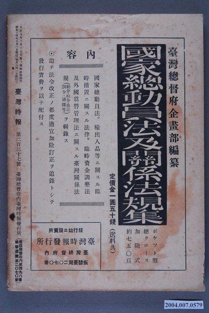 此為一紙質雜誌,此書為臺灣總督府內臺灣時報發行所於1939年(昭和14年)9月1日出版的《臺灣時報》九月號。 《臺灣時報》為1919年創辦的日文雜誌,1945年停刊。主要刊載內容有教育、司法、文藝、農產、貿易等各個面向的論文,本書便是其中之一。此刊物的前身可追溯至日本治臺初期的殖民研究計畫,即1898年由「臺灣協會」發行的機關刊物《臺灣協會會報》。