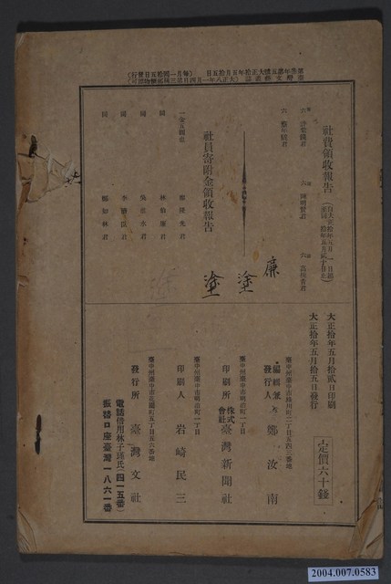 1.本文物為1921年臺灣文社發行《臺灣文藝叢誌》第參年第五號,該書內容有10篇,分別是「荀子性惡篇平議」、「高溪翁諸辞」、「漢醫漢藥改正論」、「衣服之沿革」、「蕭何諸葛亮合論徵文」、「古今詩話菁華」、「艷藻」、「蕉窗掇錄」、「遊戲文章」、「小說」,最後還有本誌定價表、聲明、社員寄附金領收報告。