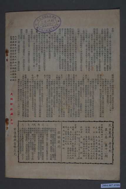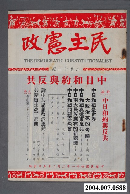 此為一紙質雜誌,此書為民主憲政雜誌社於1952年(民國41年)2月25日出版的《民主憲政》第二卷第十二期。 此物件為《民主憲政》半月刊,創辦於1951年。此《民主憲政》主要內容為對國際局勢的評論,以及臺灣國內的政治制度的談論以及意見,同時刊載部份文章,此雜誌的主要出版人員多與國民黨有關,因此此雜誌時常發表國民黨相關政治文宣,其中重要的出版人員有蔣公亮。蔣公亮為雲南人,畢業於黃埔軍校並在中日戰爭期間加入軍隊作戰,戰後當選制憲國民大會代表,後隨中華民國政府來臺後任行政院總體戰執行委員,並主持《民主憲政》半月刊。 在戰後初期,出版法規的鬆綁促使臺灣的雜誌大量創辦,然而1946年行政長官公署下令禁止使用日文,使雜誌受到語文限制的打擊,更於1947年發生二二八事件,大量的雜誌遭到查禁,其後僅有官方雜誌以及受到官方贊助的雜誌得以存活,物價的飆漲更進一步限制雜誌的生存。在1949年戒嚴之後,言論自由受到限制,民間雜誌更受到影響,知識分子僅能從文藝、人文思想方面尋找出口,形成1950至1960年代文藝雜誌大量出現的狀況。