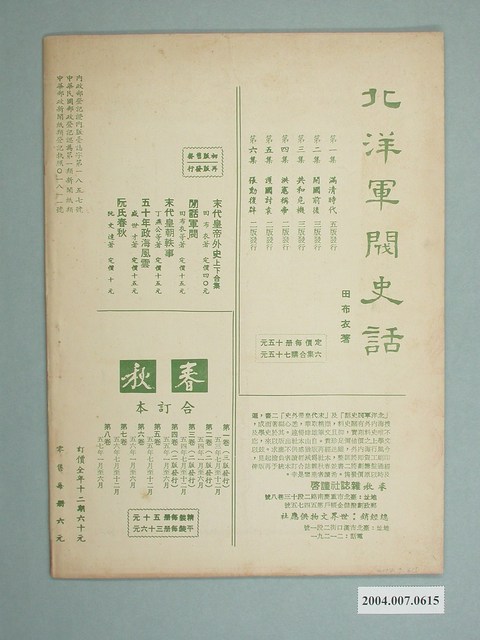 本件為《春秋》雜誌第9卷第6期,出版於民國57年12月1日。封面以鼎型線條為底圖。右邊有「詩既亡、春秋作」,左邊有「寓褒貶、別善惡」等字,下方寫民國57年12月1日出版日期。該雜誌以撤退到臺灣的相關軍政各級官員及相關人員等回憶過去相關歷史,議論相關時事等為主。