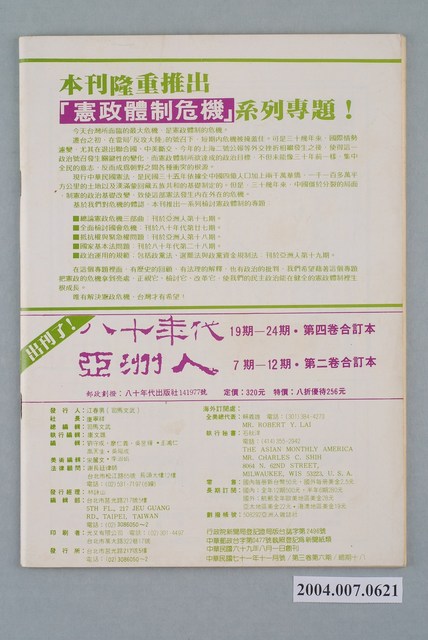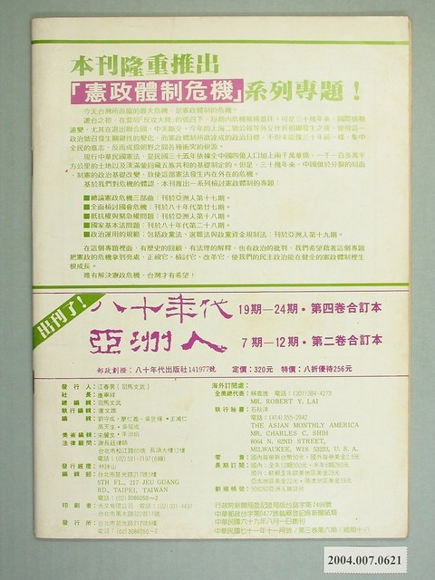 此為亞洲人雜誌社1982年11月出版的《亞洲人》月刊第3卷第6期總號18號11月號,內容計有〈正視緊急權與抵抗權的衝突〉、〈緊急權不能淪為政爭的工具〉(張述權)、〈憲政學者.康寧祥「緊急權與抵抗權」對話〉、〈卅年戒嚴體制下的抵抗權〉(卓台生)、〈黨外立委國會大質詢〉(錢兆人)、〈索忍尼辛風暴的內幕〉(萬良喜)、〈反共的唐吉訶德 -索忍尼辛在美國引起的爭論〉(李台生)、〈風起雲湧的桃園黨外〉(高武雄)、〈兩大報是傳令兵,馬前卒?〉(謝炳文)、〈愛錢不愛衛生〉(胡英玉)、〈永遠的孫中山〉(黃千芝)等。 此件為康寧祥創辦的《亞洲人》雜誌,是為了接替被查禁的《八十年代》繼而發行的刊物,為臺灣黨外雜誌的重要代表。除了編輯方向較同時期刊物更具國際觀,《亞洲人》最大的特點在於其溫和、體制內改革立場,與當時以激進風格聞名的《美麗島》雜誌呈現鮮明對比,為臺灣溫和派、議會路線的起源(蕭淑玲,2006,77-79)。 「黨外」一詞主要為非中國國民黨的臺灣政治勢力,而「黨外」政治勢力,主要的宣傳方式為「黨外雜誌」,「黨外雜誌」最早如1950年代的《自由中國》、1970年代的《大學》、《臺灣政論》,後在1980年代「黨外雜誌」發展蓬勃,代表刊物為《八十年代》與《美麗島》,最終,這股媒體趨勢在1986年民進黨成立、1987年解除戒嚴之後逐漸式微。「黨外雜誌」在當時激起了臺灣民眾的民主意識,也逐步促成了言論自由開放。(蕭淑玲,2006,153-155)。