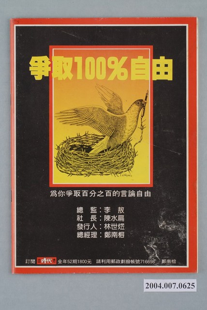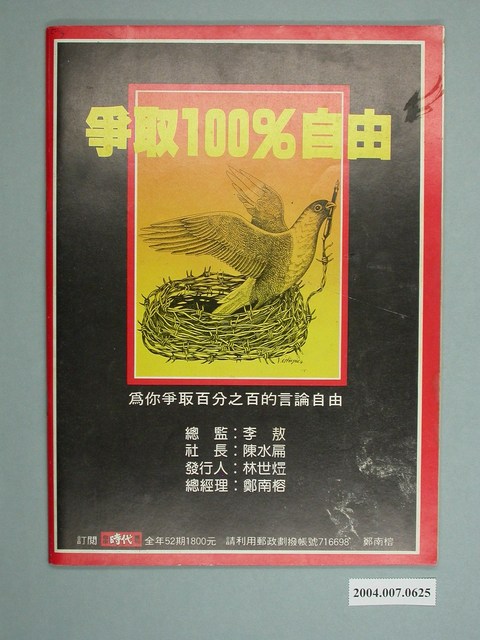 此為自由時代雜誌社1984年4月23日出版的《自由時代》周刊第7號,內容計有〈鐵路是漲價的禍首──李登輝惹的禍〉(劉亞清)、〈設置立委助理的風波〉(弄臣)、〈誰能教省主席準時下台〉(張東權)、〈長庚醫院的『新鮮』屍體〉(紅楠)、〈新「藥」與舊病──賀李敖四十九歲生日‧祝李敖再活四十九年〉(孟絕子)、〈國民黨的頭大,黨外的頭裂──新竹市長補選分析〉(陳仁)、〈台灣諺語新解〉(李阿輝)、〈王玉雲打官司的本事──以「台時」爭霸戰為例〉(泰石)、〈看誰面子大──高雄市議員介紹人事排行榜〉(徐開)、〈貝隆──阿根廷不會為你哭泣〉(筱鳴)、〈「紅包笑納,請開刀」──台大醫師談台大重重黑幕〉(王美麗)、〈許信良也求神問卜〉等。 此物件為鄭南榕所創辦的《自由時代》系列雜誌之一。由於意識到出版審查之嚴峻,鄭南榕在刊物創辦之初便註冊了為數眾多的「時代」系列標題,以免後續因遭查禁而無法準時出刊,另《自由時代》為保護相關供稿者,鄭南榕主動承擔《自由時代》一切文責,且不在雜誌目錄頁著錄個別作者姓名。《自由時代》標榜著「爭取百分之百的言論自由」,致力於追蹤黨國內幕、打破禁忌話題,也籌劃街頭社會運動――如「五一九綠色行動」。《自由時代》訴求黨外組黨,在民主進步黨成立後則主張群眾路線,對於較保守的公職路線則加以批判。 「黨外」一詞主要為非中國國民黨的臺灣政治勢力,而「黨外」政治勢力,主要的宣傳方式為「黨外雜誌」,「黨外雜誌」最早如1950年代的《自由中國》、1970年代的《大學》、《臺灣政論》,後在1980年代「黨外雜誌」發展蓬勃,代表刊物為《八十年代》與《美麗島》,最終,這股媒體趨勢在1986年民進黨成立、1987年解除戒嚴之後逐漸式微。「黨外雜誌」在當時激起了臺灣民眾的民主意識,也逐步促成了言論自由開放。(蕭淑玲,2006,153-155)。