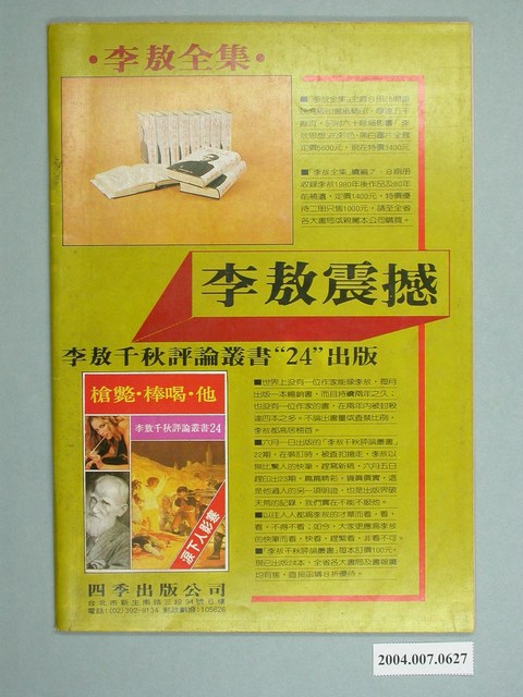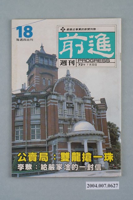 此為前進雜誌社1983年7月30日出版的《前進》週刊第18期,內容計有〈多革了的一點命-給嚴家淦先生的一封信〉( 李敖)、〈公賣局:雙龍搶一珠-設置麥芽廠預算風波平議〉(史風)、〈肥了政府,瘦了人民!-公營專賣制度的檢討〉(高次山)、〈全斗煥是如何崛起的?(中)-「十二.十二」事件的一段秘辛〉(黃鈴雯)、〈基隆獄監二三事-由王正玉逃獄談起〉(蘇克福)、〈大贏日本隊後又怎樣?籃球國手心事誰人知?〉(張王開)、〈風起雲湧的嘉南大平原-國民黨在四選區所面臨的挑戰〉( 陳平)、〈雷渝齊何不加入黨外?-從「雷渝齊質詢事件」談起〉(康橋)、〈叫「法統」們收回香港〉( 于不平)、〈賈魯塞斯基宣布解嚴〉等。 此物件為林正杰創辦的《前進》雜誌系列出版品之一。由於戒嚴期間的出版管制,《前進》面對警總的連番查禁,陸續更改刊名,計有《前進周刊》、《前進廣場》、《前進時代》、《前進世界》等。《前進》之創辦,以「在報禁下尋找更接近真實的客觀報導」為核心理念,其重要創辦人有林正杰、蔡式淵、蔡仁堅,三人皆為民進黨早期派系「前進系」成員。由於認同立場與民進黨在解嚴之後的路線相左,林正杰在1991年民進黨通過「臺獨黨綱」後宣布退黨,其所領導的「前進系」也隨之解散。 「黨外」一詞主要為非中國國民黨的臺灣政治勢力,而「黨外」政治勢力,主要的宣傳方式為「黨外雜誌」,「黨外雜誌」最早如1950年代的《自由中國》、1970年代的《大學》、《臺灣政論》,後在1980年代「黨外雜誌」發展蓬勃,代表刊物為《八十年代》與《美麗島》,最終,這股媒體趨勢在1986年民進黨成立、1987年解除戒嚴之後逐漸式微。「黨外雜誌」在當時激起了臺灣民眾的民主意識,也逐步促成了言論自由開放。(蕭淑玲,2006,153-155)。