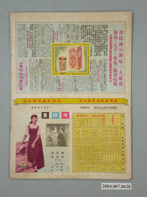 此為一紙質雜誌。此書為亞洲出版社於1958年(民國47年)8月出版的《亞洲畫報》第64號。 此物件為香港亞洲出版社出版的《亞洲畫報》,於1953年創刊,其內容大多為常識、科學、風土民情的文章,旨在增進讀者知識,另外也刊載冷戰對立的國際情勢以及反共宣傳的內容,《亞洲畫報》為接受美援產生的出版品,因此與當時西方刊物的形式十分相仿且刊登有不少西方影星的性感照片,並附有相當大量的圖片,主要的發行地區為香港以及臺灣。 「亞洲出版社」於1952年在香港成立,主要以反共及追求自由為目的,且由曾經任職美國聯合通訊社的張國興所主持,並接受美國方面的金錢援助創辦,除了出版宣傳反共的《亞洲畫報》,另外在文學作品上以現代文學以及反共文學為主要的出版項目,作者多為臺灣作家,如撰寫《半下流社會》的趙滋蕃以及撰寫《聖潔的靈魂》的謝冰瑩。