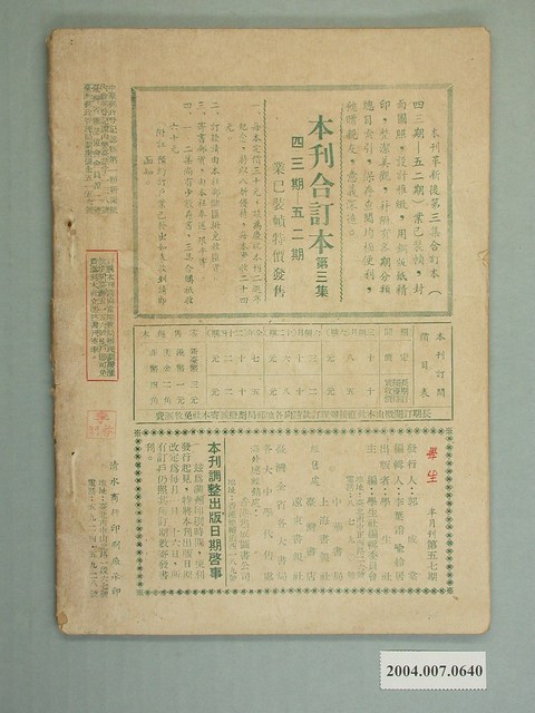 1.本件為《學生》半月刊第57期,出版於民國41年12月1日,由學生社刊行。封面有胡適的照片,封底有該雜誌的出版資料,發行人郭成棠;編輯李業霜、喻舲居;主編學生社編輯委員會等。2.《學生》半月刊,曾短暫出刊後停刊,教育廳長陳雪屏找來郭成棠續辦,郭氏找來了蕭輝楷、李業霜、喻舲居等人共同推動刊物發行。郭等邀請了王雲五、崔書琴、梁實秋、陳之藩等名家寫稿,使得該刊物大受歡迎。曾被殷海光是為當時臺灣有兩份半刊物,一是《自由中國》,一是《學生》,半份是高雄出版的《拾穗》。