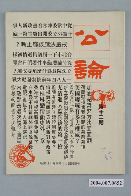 此為1981年4月10日出版的《公論》雜誌第12期,內容要目計有〈從中常委陣容看政黨新人事〉、〈十黨外立委開出廟堂第一砲〉、〈戒嚴法應該廢止嗎?〉、〈臺北市下一屆議員選情初探〉、〈從荷蘭潛艇事件看明日臺灣〉、〈立法院長為什麼須要改選?〉、〈一九八四年蘇俄將發動大戰〉、〈加油站舞弊方法面面觀〉、〈荷蘭堅持售我潛艇的幕前幕後〉、〈美國總統有多大權威?〉、〈國民黨的「散兵遊勇」應允重新歸隊〉、〈新立委掀起正副院長改選風波經緯〉、〈尤清進入監院後的第一槍〉、〈監院有無建立聽證制度的必要?〉、〈雷根海格商訂美國最新對華政策〉、〈賈桂琳戀情韻史外一章〉、〈香港大幅提高薪俸免稅額了〉、〈白水疊不甘薪祿另闢財源幕後〉、〈電視「復仇者」人海上演記〉、〈內政部長這次說了實話〉、〈雷根面臨著多少難題〉等。 《公論》創刊於1980年5月10日,以月刊形式發行,社長為胡炫,發行人為吳修漢。《公論》的內容以政論為主,其創刊詞中所秉持的立場為「堅決執行反共國策」、「弘揚民主憲政,擴大政治參與」、「向政府諍言,是國民黨諍友」。