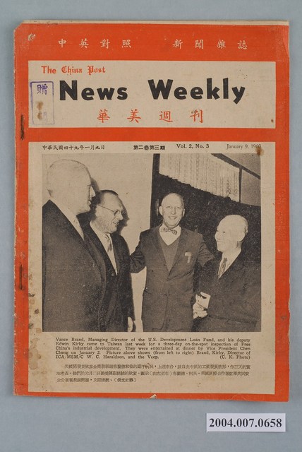 此為一紙質雜誌,在封面照片為「美國開發貸款基金業務經理布萊德來臺考察臺灣工廠」的照片,照片右方為時任副總統的陳誠。此書為華美週刊社1960年(民國49年)1月9日出版的《華美週刊》第2卷第3期。 此刊物為《華美週刊》(The China Post News Weekly),為《英文中國郵報》(The China Post)的系列刊物。《英文中國郵報》由余夢燕、黃遹霈夫妻在1952年共同創辦,為臺灣第一份英文報紙。余夢燕為臺灣的知名辦報人,曾任亞太廣告協會主席、世界女記者與女作家協會世界總會總會長,也是中國國民黨第10屆中央委員會黨務顧問、第11至13屆中央評議委員。