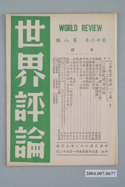 此為一紙質雜誌,此書為世界評論社於1979年(民國68年)7月出版的《世界評論》雜誌第26年第8期7月號。 此件物件為《世界評論》,在1952年由陳奇創辦,為臺灣的政論雜誌,此雜誌的言論反對臺獨並在立場上偏向國民黨,發行形式由週刊改為半月刊,後改為月刊。 在戰後初期,出版法規的鬆綁促使臺灣的雜誌大量創辦,然而1946年行政長官公署下令禁止使用日文,使雜誌受到語文限制的打擊,更於1947年發生二二八事件,大量的雜誌遭到查禁,其後僅有官方雜誌以及受到官方贊助的雜誌得以存活,物價的飆漲更進一步限制雜誌的生存。在1949年戒嚴之後,言論自由受到限制,民間雜誌更受到影響,知識分子僅能從文藝、人文思想方面尋找出口,形成1950至1960年代文藝雜誌大量出現的狀況。
