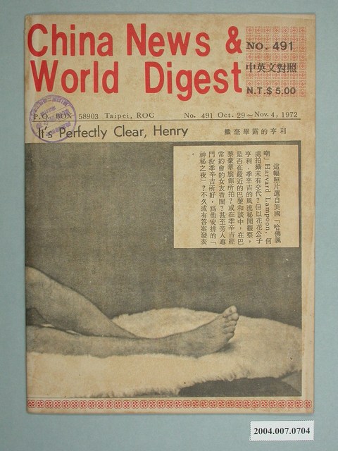 此為一紙質雜誌,在封面上方寫有本書標題,中央為本期雜誌的部份內容以及一男子的裸體照片,左方寫有本期雜誌期號以及出版日期,背面刊有英文版標題。此書為香港報導社1972年出版的《香港報導》週刊第491號。 《香港報導》為一綜合性的新聞週刊,發行人為鍾樹楠。《香港報導》以港、中、臺三地的政經發展為主軸,亦引介國際情勢與潮流新知。 《香港報導》原名《香港週報》,於1963年8月10日創刊於香港,1965年4月1日起同時在臺北出版,1972年7月16日起擴大改為單行本。而後,在1973年8月更名為《中國報導》。