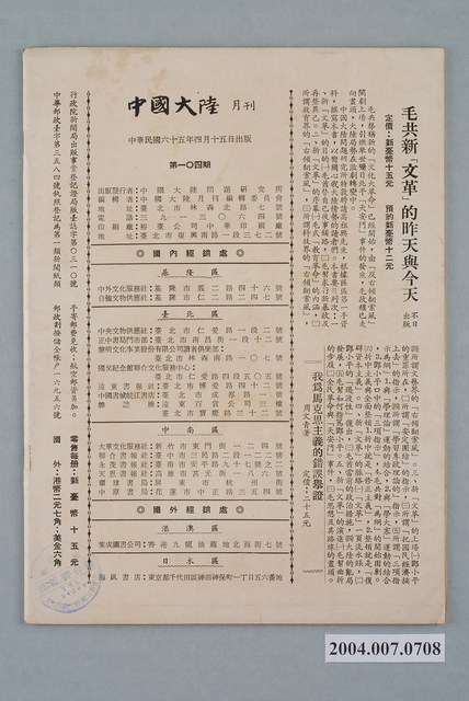 此為一紙質雜誌,為中國大陸研究所於1976年(民國65年)4月15日出版的《中國大陸》月刊第104號。 此物件為《中國大陸》雜誌,由中國大陸問題研究所編輯出版並於1971年創刊,早期雜誌內容大多是關於中國方面的情勢,並且大多報導中國共產黨的負面新聞,之後則更多為評論兩岸的政治關係。而本書的出版者「中國大陸問題研究所」為中國國民黨下屬的對中國研究機構,由「中國國民黨中央委員會第二組」組成,其成立主旨為「聯合學者專家研究中國大陸問題,供有關當局參考,並增進國人認識的目的。」