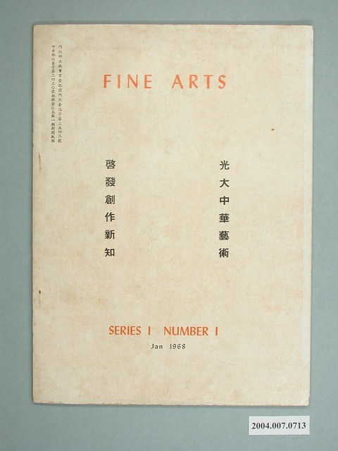 1.本件《蓺壇》雜誌創刊號,藝壇雜誌社出刊於民國57年1月,丁念先主編,以「宋人山亭文會圖,念聖樓藏宋元集冊之一」圖像為封面,封底有「FINE ARTS,光大中華藝術,啟發創作新知」等字樣。2.據國家圖書館「中華民國期刊指南系統」所收此月刊,創刊號書影與本件一樣,僅下方出版項目,為「民國五十七年三月」,共出版326期,至民國85年11月的326期後停刊。有可能是原創刊號內容有所更換導致有一月與三月兩種版本。