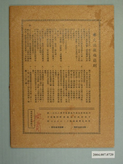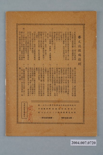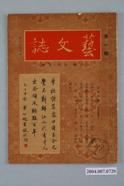 1.本文物為1965年藝文誌月刊社發行《藝文誌》第一期十月號,期內容主要分成5部分,分別是史事今談,如〈抗戰勝利與臺灣光復二十年抒感〉;人物傳記如〈我所瞭解的陳辭修先生〉;燃犀新錄如〈李宗仁投匪經緯談〉;藝文中心如〈張大千題畫師〉;河山攬勝如〈昆明之憶〉,諸多篇目共有19篇,除此之外還有徵稿啟示,跟該刊物之風格追求為「真實性、高尚感、風趣化與人情味」。