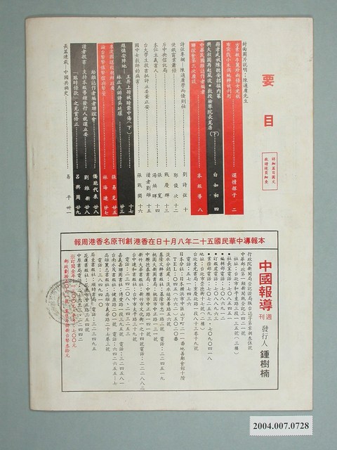 此物件為1983年11月13日出版的《中國報導》第1052期,刊物封面印有「指點未來的前瞻性週刊」字樣,內容要目計有〈方素敏李麗珍兩條女光棍 布袋戲小木偶純粹被利用〉、〈蔣孝武被陳聽安招搖內幕 興大校園再起風波•教授檢舉院長荒唐(下)〉(白如初)、〈中華民國雜誌作者編者聯誼會第三次座談〉、〈詩弦專欄―陳適庸學而優則仕〉(劉詩弦)、〈使鐵窗業蕭條〉(郭俊次)、〈斥中央信託局〉(戰慶輝)、〈本位主義害人〉(張寬、湯煥暉)、〈臺大學生投書批評立委黃正安〉(讀者劉雄)、〈國中女教師的病害〉(張戰獨)、〈趙慎安陣地―王昇上將被暗箭中傷(下)/林正杰誹謗吳廷環〉、〈朱波國謀殺朝鮮政要〉(張易克)、〈論台幣幣值幣信與幣量〉(林海連)、〈讀者投書:給雜誌作者編者聯誼會/支持本報導鍾發行人競選立委/「臨時條款」之充實修正〉、〈長篇連載―中國共禍史〉(易平)等。 《中國報導》創刊於1973年10月28日,以週刊形式發行,發行人為鍾樹楠,其內容著重國際政治報導,並刊載國外新知短文中譯。 1970年代,中國國民黨主政的中華民國政府在外交與內政上屢遭挫敗,國民黨的統治出現鬆動,對此蔣經國採取部份改革的方式試圖拉攏民心、穩定政權,因此臺灣社會得以出現批判、建議政府的聲音。在雜誌方面首先由1970改組而成的《大學雜誌》做為開端,以及1975年接續創刊的《臺灣政論》,最後在1979年創刊的《美麗島》這一系列的雜誌,對臺灣的民主化帶來重要影響。