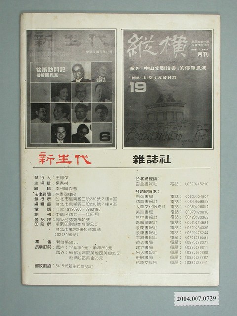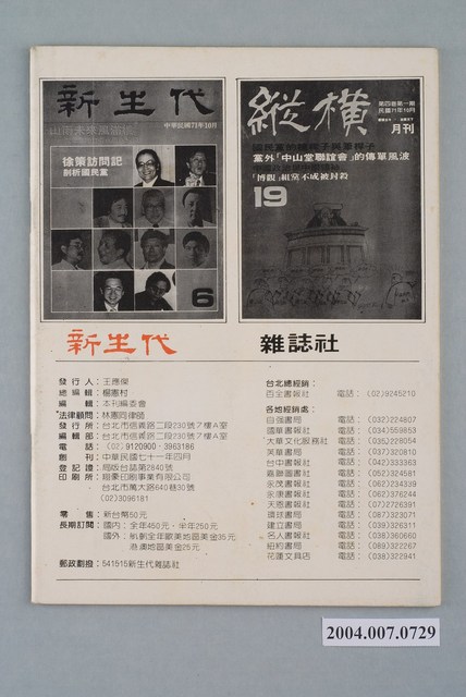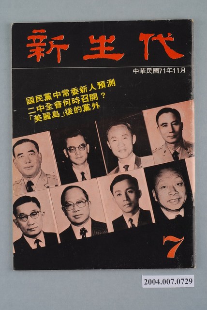 此為新生代雜誌社1982年11月出版的《新生代》雜誌第7號,內容計有〈國民黨中常委新人預測〉(山中人)、〈國民黨應儘快召開二中全會〉(李凡)、〈反共形勢一片大好?〉( 蔡忠)、〈「美麗島」事件後的黨外〉(李旺台)、〈黨內外的缺點與改進之道〉( 黃錦興)、〈黨外中山堂集會觀察〉( 劉志聰)、〈匆匆,別太匆匆!-論小黨外與大黨外〉(賀越)、〈中國時報左右開弓-余紀忠出現政治危機〉(章魚)、〈新聞記者這一行〉( 李鳴元)、〈「暖流」為改革文化而努力-訪廖仁義〉、〈停刊不是失敗-訪徐璐〉、〈索忍尼辛追逐賽〉(唐璜)、〈洪總幹事的憂慮〉(李哮佛)等。 《新生代》月刊創刊於1982年4月,總編輯為汪立峽。在當時黨外雜誌的光譜中,《新生代》屬於較為保守穩健的一端,其政論立場傾向於體制內改革,提倡不分黨內外的民主運動。 「黨外」一詞主要為非中國國民黨的臺灣政治勢力,而「黨外」政治勢力,主要的宣傳方式為「黨外雜誌」,「黨外雜誌」最早如1950年代的《自由中國》、1970年代的《大學》、《臺灣政論》,後在1980年代「黨外雜誌」發展蓬勃,代表刊物為《八十年代》與《美麗島》,最終,這股媒體趨勢在1986年民進黨成立、1987年解除戒嚴之後逐漸式微。「黨外雜誌」在當時激起了臺灣民眾的民主意識,也逐步促成了言論自由開放。(蕭淑玲,2006,153-155)。