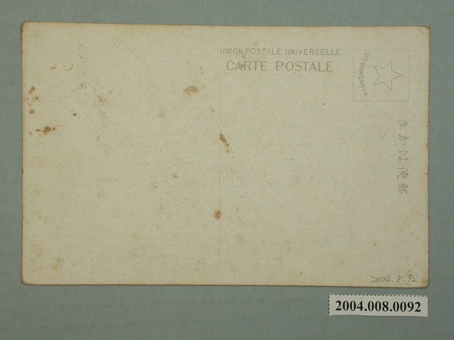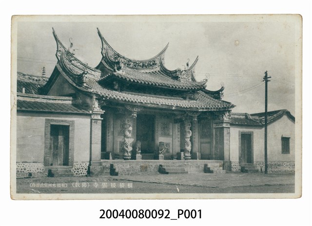 1.本物件為以板橋接雲寺為主題之明信片,其正面為接雲寺之正面全景黑白照片,其屋頂採歇山重簷假四垂,左右兩側以燕尾高翹,山川脊上並未有過多裝飾,正殿正脊上可見五層寶塔,寺廟門面為五開間,左右兩側尚有廂房,畫面中右側上有一電線桿,廟前空間則為廟埕,明信片之右下角有「板橋接雲寺(佛教)(板橋光画寫真館作)」字樣。背面為空白明信片橫式書寫面,以褐色單色印刷,右上角有郵票黏貼處,內有星形圖案及「UTSUNOMITA」字樣,右側有「郵便はがき」,正上方則有「UNION POSTALE UNIVERSELLE」及「 CARTE POSTALE」字樣。2.西元1729年漳州人創「中和慈雲巖」,該巖位於高處,供奉觀音媽,有鑑於板橋無觀音,板橋林家遂搭建一簡單廟宇,每年定期供請觀音媽,慈雲巖於一次漳泉械鬥中毀於祝融,幸虧當時觀音媽供請至板橋才得以安全。1856年,板橋信士推舉林國芳將神像長久迎至板橋,為其建廟命為「接雲寺」,意旨「承接慈雲巖香火」,而後接雲寺因地處計畫用地,遂於1887年搬遷至現址。