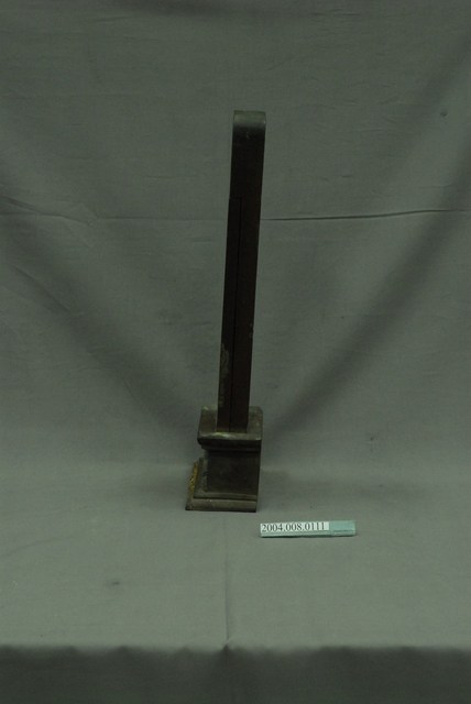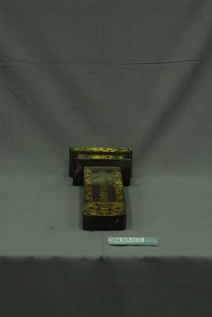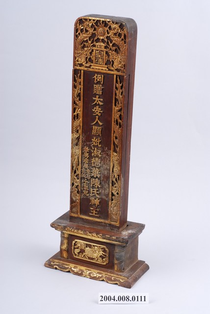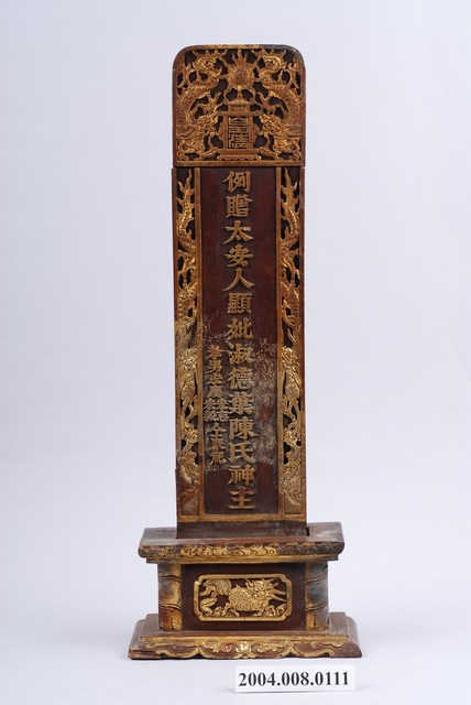 神主牌是家屬奉祀已逝親人的牌位,神主牌上所雕紋形有規制,官宦之家會雕龍形紋,平民百姓只能雕梅花與雀鳥。本件葉門王氏神主牌,正面上方與兩側雕龍紋,上方中間雕有牌位形,中間有「皇清」兩字,神主牌全名「例贈太安人顯妣淑德葉陳氏之神主」左下方有「男宏志宏毅奉祀」等字,下有基座,正面雕麒麟圖,文字與麒麟、龍紋等紋飾漆金色漆。保存完整,惟神主牌下半段有一片霉斑。