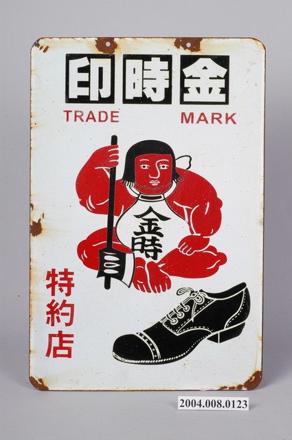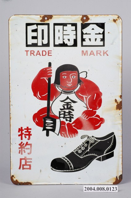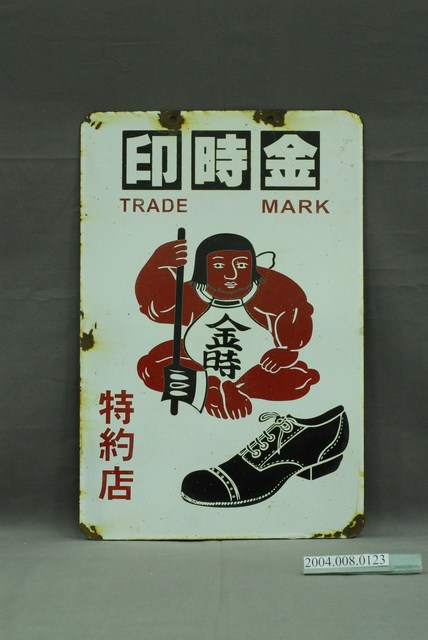 本物件為商標廣告鐵牌1面。商標廣告為白色底色,正上方有黑底白字「金時印」及紅字「TRADE MARK」;左下方有紅字「特約店」;商標廣告中央繪有1名紅膚男子席地而坐,手持1黑色斧頭,身穿1件有「金時」2字的白衣;商標廣告右下方繪有1隻黑色皮鞋。