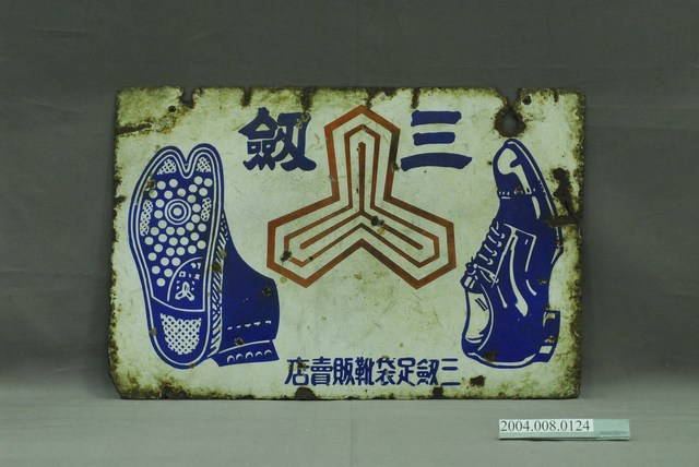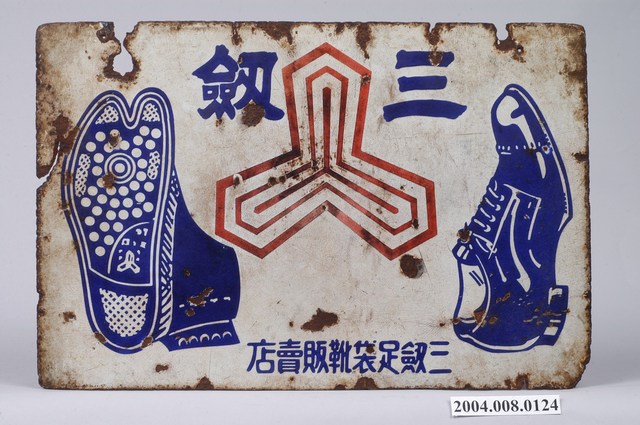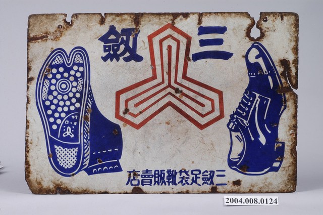 1.本物件為三劎足袋廣告長方形鐵牌,四周已有鏽蝕,頂端有鑽2孔,供吊掛。上繪有新式地下足袋(傳統足袋下縫橡膠,可做外出鞋)之鞋側及鞋底,中有其三角錐的三劎商標,下方標明「三劎足袋靴販賣店」。雙面為同樣的圖案。