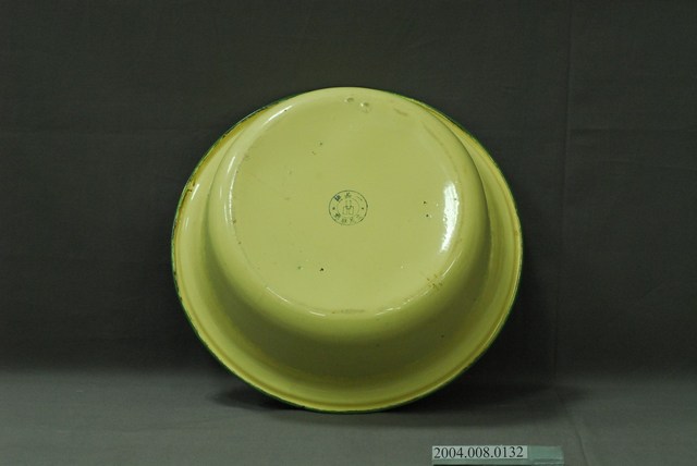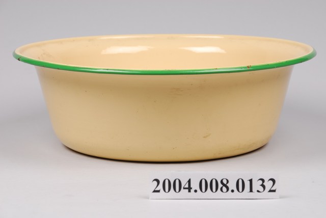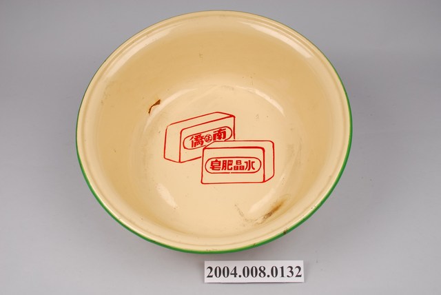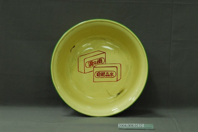 1.此為搪瓷製面盆,長約34公分,寬約34.3公分,高約10.8公分。器身呈撇口淺壁圓盆,以淡黃為底色,內側底部以紅色線條繪製南僑水晶肥皂商標,外側底部印有立茂琺瑯一品牌的藍色品牌商標。器頂口緣外撇折沿帶唇,唇緣鑲綠色邊,折沿處有一凹陷內圈設計。器身內側底部有兩處明顯鏽蝕掉漆,口緣處有少許銹蝕,器身外側底部多有器泡狀突起處,以及些許掉漆。2.搪瓷工藝自清代乾隆年間傳入民間,發展出搪瓷工業。此種材料防酸防鹼,表面光滑容易清潔,價格低廉,但脆性大容易崩裂。傳統盥洗時,需在大灶燒熱水或於水缸盛冷水後,倒入面盆之中洗臉或洗手。面盆會搭配洗臉台,使用高度較為方便。立茂琺瑯於1960年代成立,專營生產琺瑯生活器具,此器由立茂琺瑯生產,是南僑水晶肥皂之宣傳紀念品。