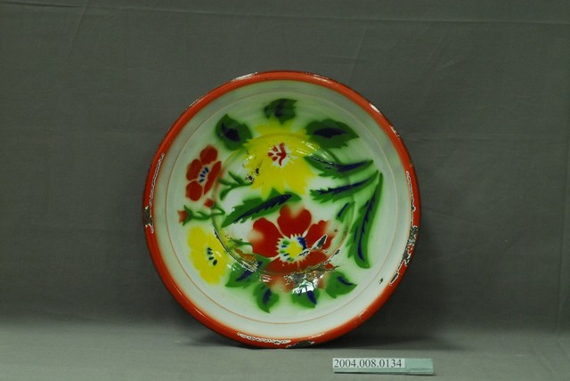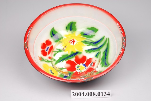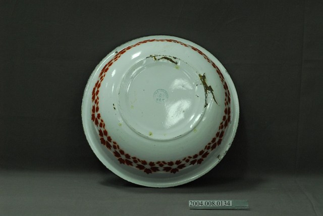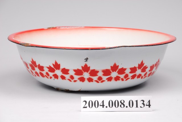 1.此為搪瓷製面盆,長約33.7公分,寬約33.4公分,高約9.9公分。器身呈敞口淺壁圓盆,以白色為底,內側底部繪有紅花和黃花,以綠葉陪襯,外側以紅花橫飾繞圈綴於器腹。器頂口緣外敞折沿,外緣鑲紅色邊,器腹內側有一凹陷、向外突出之內圈設計。器底外側作一平底寬幅圈足,印有DOUBLE COIN BRAND雙錢牌的藍色品牌商標。器身內側底部及口緣處有多處明顯鏽蝕掉漆,器身外側及底部多有氣泡狀突起及掉漆銹蝕處,並有多處因碰撞產生之凹痕。2.搪瓷工藝自清代乾隆年間傳入民間,發展出搪瓷工業。此種材料防酸防鹼,表面光滑容易清潔,價格低廉,但脆性大容易崩裂。傳統盥洗時,需在大灶燒熱水或於水缸盛冷水後,倒入面盆之中洗臉或洗手。面盆會搭配洗臉台,使用高度較為方便。此外,繪有雙花之面盆大多也作為女子出嫁嫁妝,象徵夫妻白頭偕老、永浴愛河。