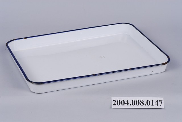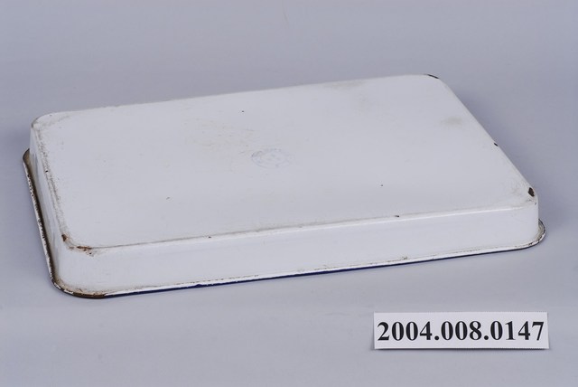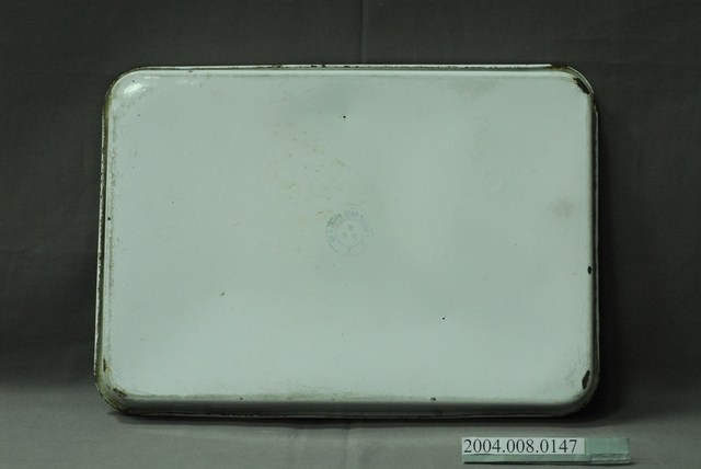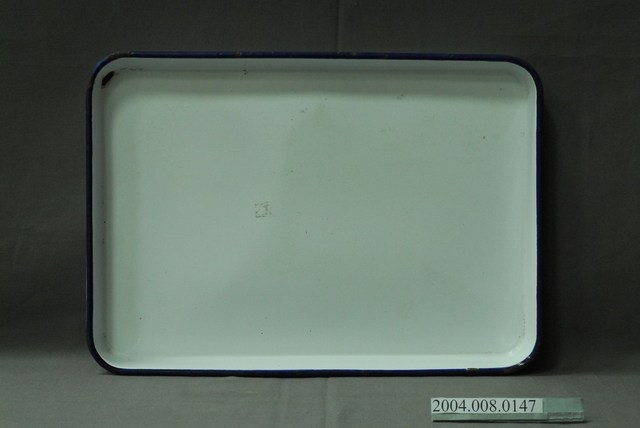 1.三星牌藍邊白底素面搪瓷方盤,長方形、圓角、周圍豎邊、平底淺盤,盤沿往外向下內捲作圓弧邊。以鐵金屬為胎,表面塗有白色瓷釉,盤面素面無紋,口沿塗一圈深藍色釉。盤沿、背面盤底皆有些許瓷釉塊狀剝落,呈鐵鏽色,其中一側盤沿內捲處亦可見鐵鏽痕跡。背面底部中央印有一雙圈圓形落款,圓圈內部為3顆星星,上下分別為「THREE STAR BRAND」和「三星牌」品牌中英文字樣。2.搪瓷是指將玻璃或陶瓷質粉末熔合後塗在金屬製品的表面上,有防止氧化及裝飾的作用。搪瓷製品具有硬度高、耐酸鹼、易清洗的優點,在1960至1970年代曾被廣泛應用於日常生活中的飲食器具,後來因塑膠、鋁製品、不鏽鋼等價格低廉耐用的產品推出,搪瓷用品才逐漸被取代。