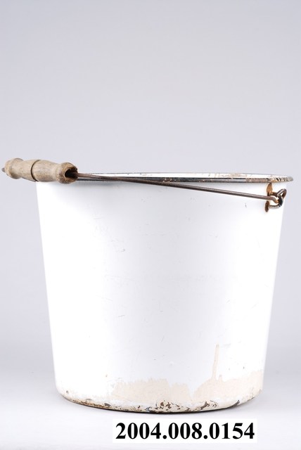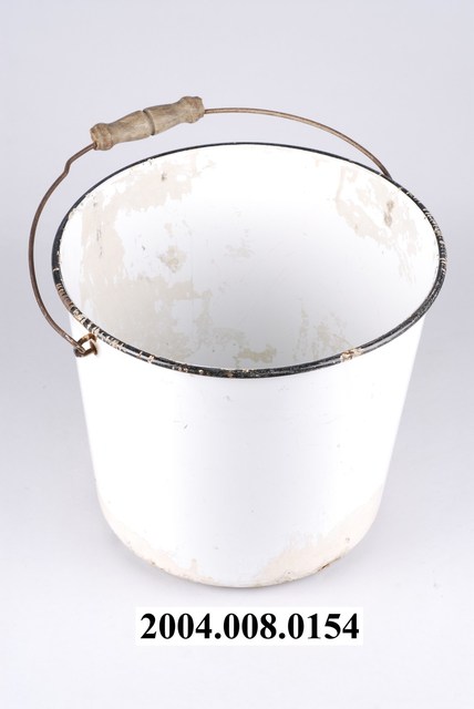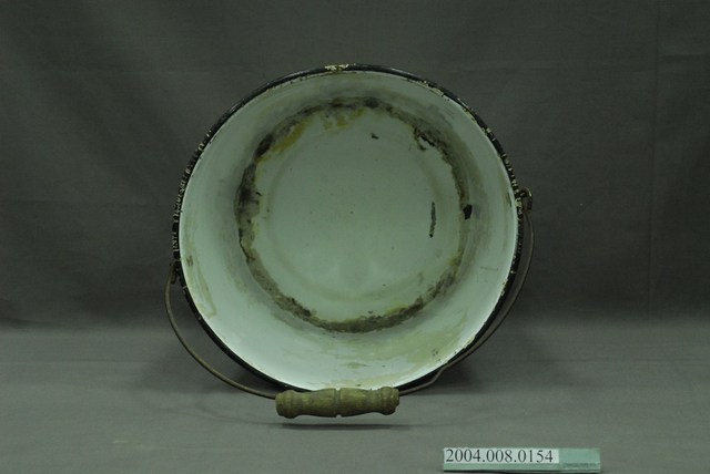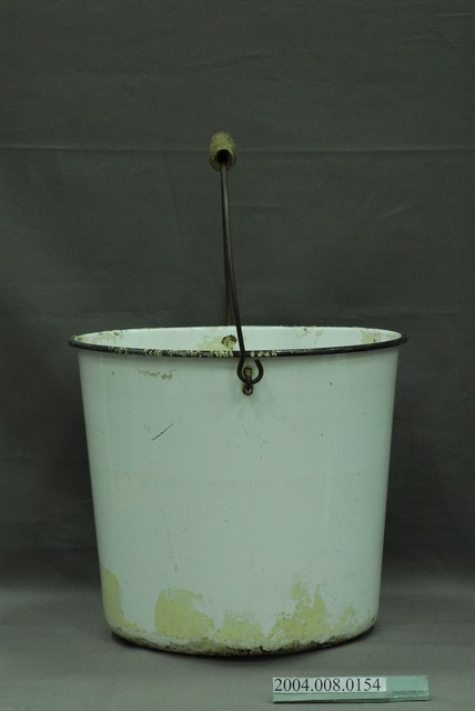 1.本件白色搪瓷水桶以鐵金屬製作桶身,表面與內面施以白色琺瑯釉料後燒製完成。水桶外觀略呈上寬下窄之深桶狀,口緣處作圓唇貌,並以黑色琺瑯彩釉料裝飾,表面帶有磕碰痕跡露出鐵質胎體。底緣呈平底,於接近口緣兩相對處帶有環形耳,並以鐵條拗製呈半圓形固定於耳部,作提樑使用,提樑中段處帶有木製圓柄握把。整體桶身內外側之底部帶有米白色漆料修補痕跡。2.本件水桶主要用於打水之器具,搪瓷材料抗腐蝕性能力強,防酸防鹼,但材質脆弱,因其價廉普遍、細膩、光亮,較容易清潔,常見於臺灣戰後日常生活。