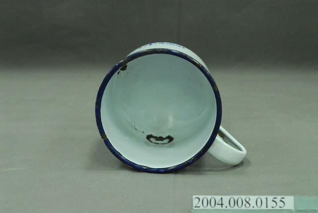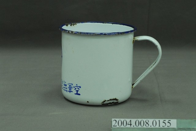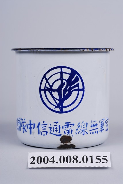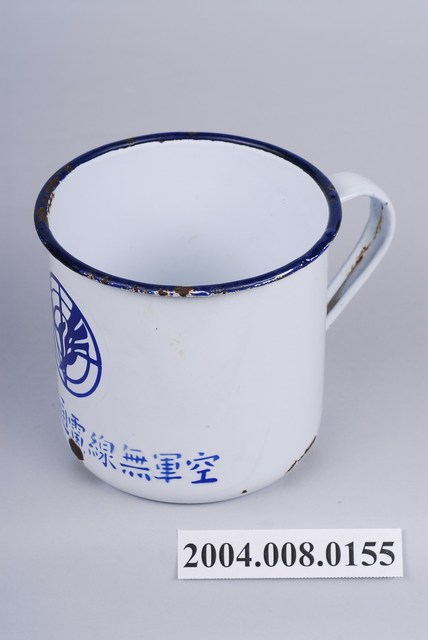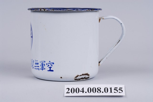 1.本件空軍無線電通信中隊馬克杯,為琺瑯材質,杯身為標準圓柱型,杯身一側有半環形把手方便握持,杯身內外為光滑白色,杯緣處以深藍做為裝飾點綴,杯身外側以深藍色印有空軍通信航管資訊聯隊隊徽及「空軍無線電通信中隊贈」字樣,杯子內側靠近底部、杯緣處及外側「電」字下方有琺瑯脫落,金屬內胎生鏽之情形;杯底有一淡藍色的雙同心圓形落款,圓心中間有一商標圖,外環處印有「□□□□□公司出品」公司名稱五個字因墨水暈開,字跡模糊無法辨識。2.無線電通信中隊隸屬於中華民國空軍通信航管資訊聯隊,通航資聯隊主要負責空軍基地內各項通信