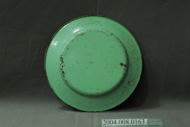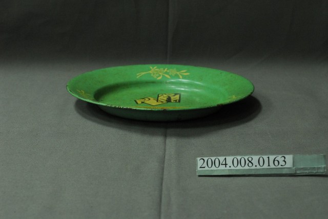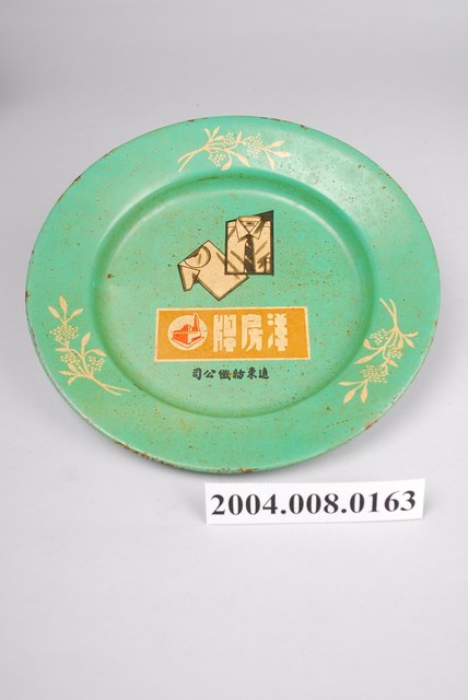 1.洋房牌遠東紡織公司綠色搪瓷圓盤,為遠東紡織股份有限公司的紀念盤。圓形、平底淺盤,盤面中央作圓形下凹,盤緣向外略斜上平折,盤沿往外向下內捲作圓弧邊。以鐵金屬為胎,表面塗有綠色瓷釉,正反面皆有褐色鐵鏽斑點與斑塊。盤底素面無紋,正面盤緣裝飾三束白色花卉紋飾,盤面印有一件白色男性襯衫繫黑白斜紋領帶與一件白色T恤圖案,下方有一白邊土黃色塊印「洋房牌」品牌字樣與商標,色塊下方印有「遠東紡織公司」六個黑色小字。2.遠東紡織公司的前身為遠東織造廠股份有限公司,於1945年在上海創立,生產洋房牌內衣,1949年隨國民政府遷臺,繼續生產針織產品,1953年成立紡織廠推出棉紡產品,1954年正名為遠東紡織股份有限公司,後來企業轉為多角化經營,2009年更名為遠東新世紀股份有限公司。
